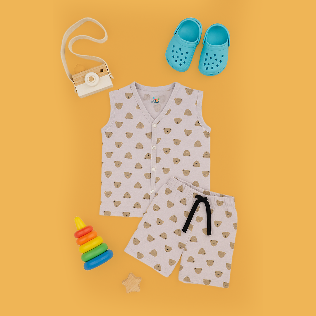 This Beige Bear Sleeveless Co-Ord Set features a sustainably stitched V-neck sleeveless T-shirt paired with comfortable matching shorts. Designed with kid-approved softness and durability, it ensures all-day comfort, while offering parents peace of mind with its responsible production. Ideal for everyday wear, this coordinated set blends style and functionality seamlessly.