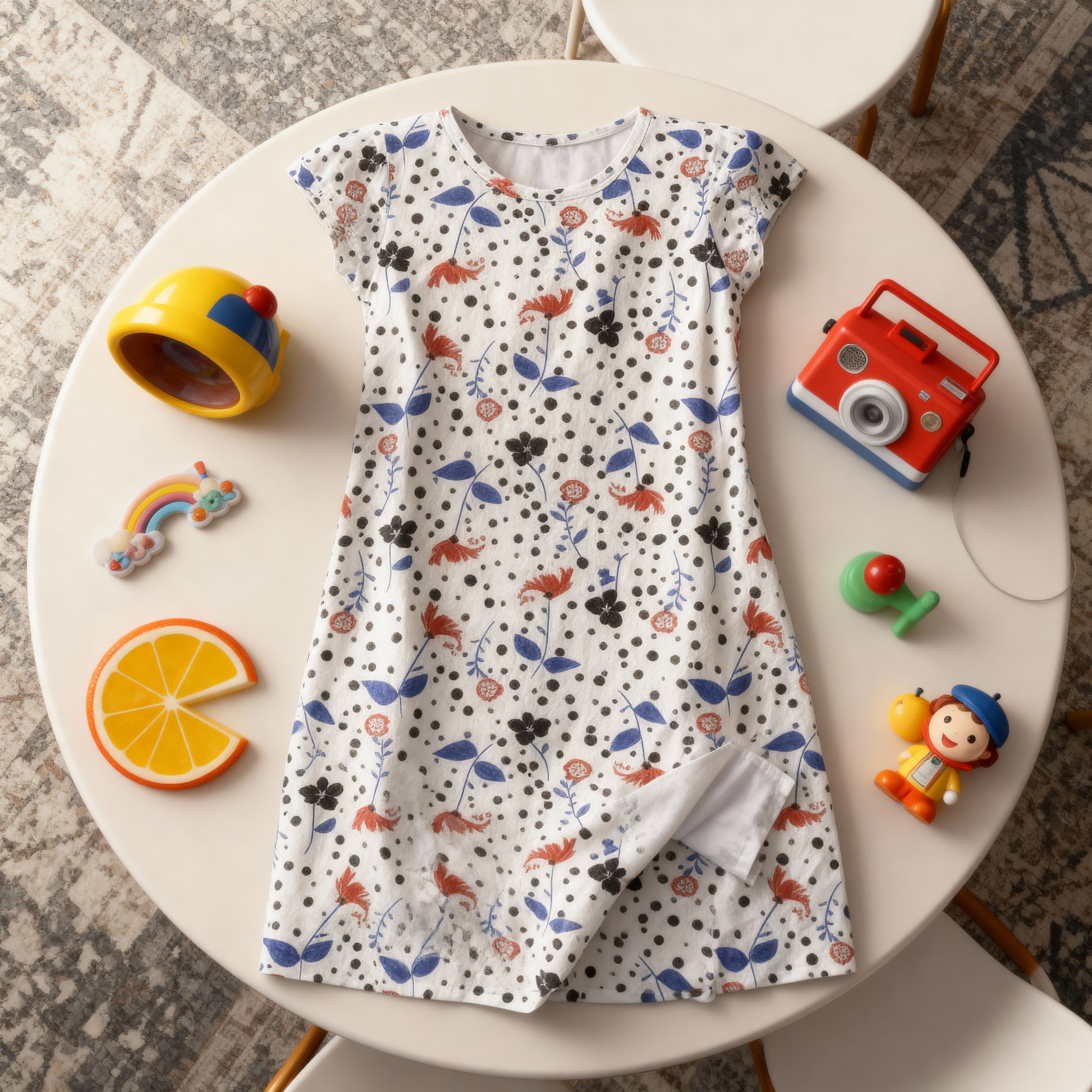 Bright, playful, and wonderfully comfortable — this Girls Floral & Polka Dot A-Line Dress is perfect for everyday wear. Designed in a soft white base with charming blue and red floral illustrations and scattered black polka dots, it brings a fresh, cheerful look to your little one’s wardrobe.