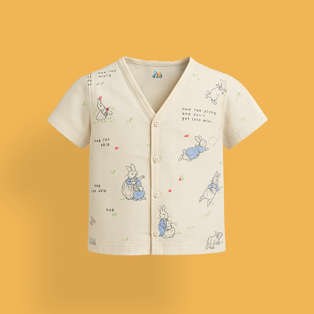 Let your little one hop into comfort with this Cream Bunny Print Baby Romper, designed for endless cuteness and carefree play. Featuring playful bunny illustrations in blue outfits and doodle-style details, this romper is sustainably stitched with love for the planet and your baby’s comfort.