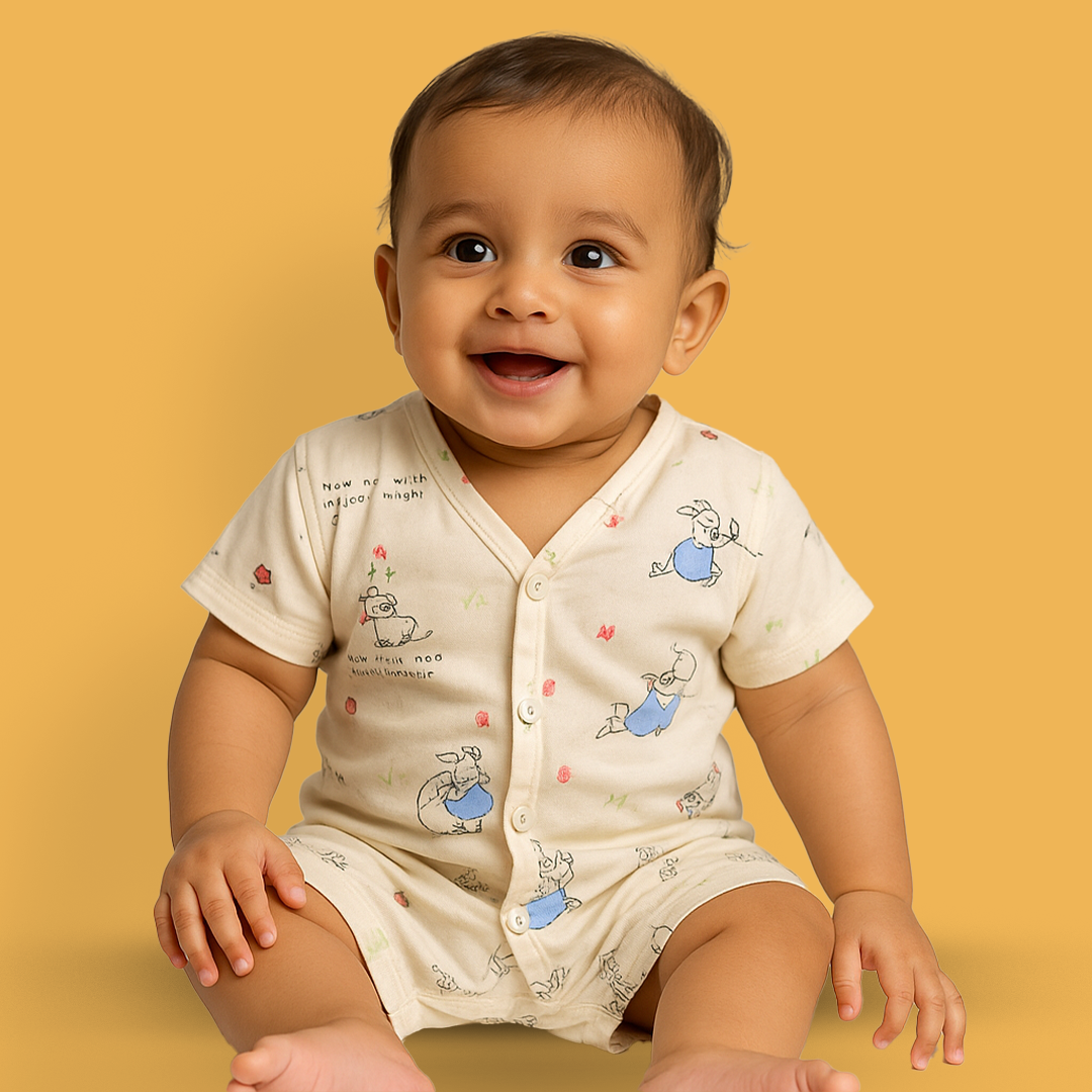 The soft, breathable fabric ensures kid-approved comfort throughout the day, while giving parents peace of mind knowing it’s skin-friendly, safe, and gentle for delicate baby skin. Perfect for naps, playdates, or everyday wear, this romper blends charm, durability, and sustainability in one adorable outfit.