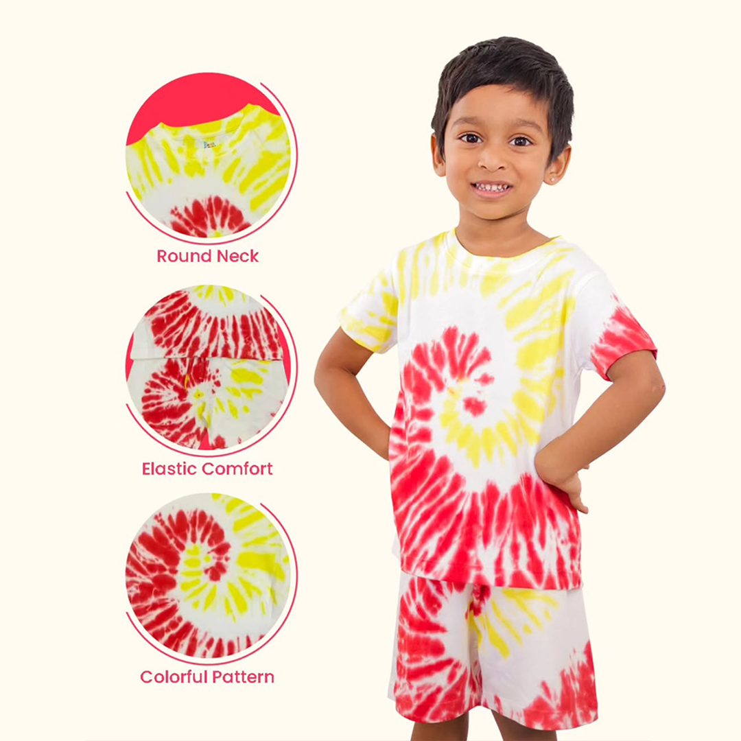 Dress your little one in joy with this vibrant tie-dye kids co-ord set. Designed for all-day comfort and endless play, this outfit features a soft, breathable fabric that’s gentle on young skin. The cheerful red and yellow spiral pattern adds a fun, energetic vibe—perfect for playtime, outings, or cozy days at home.